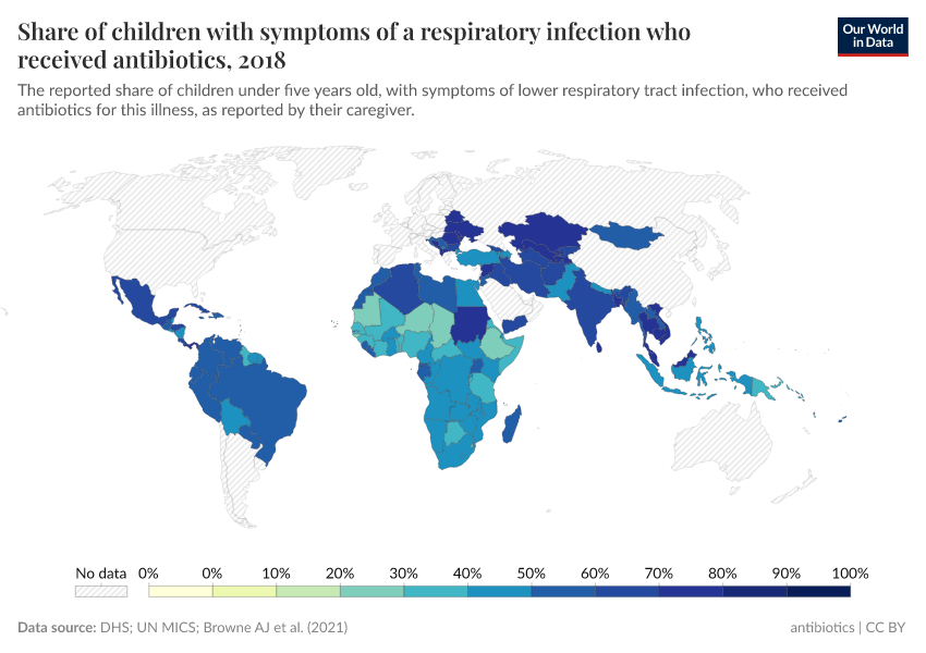The map below shows the usage of antibiotics to treat children with respiratory infections. Data comes from large-scale surveys such as the DHS and UN MICS.