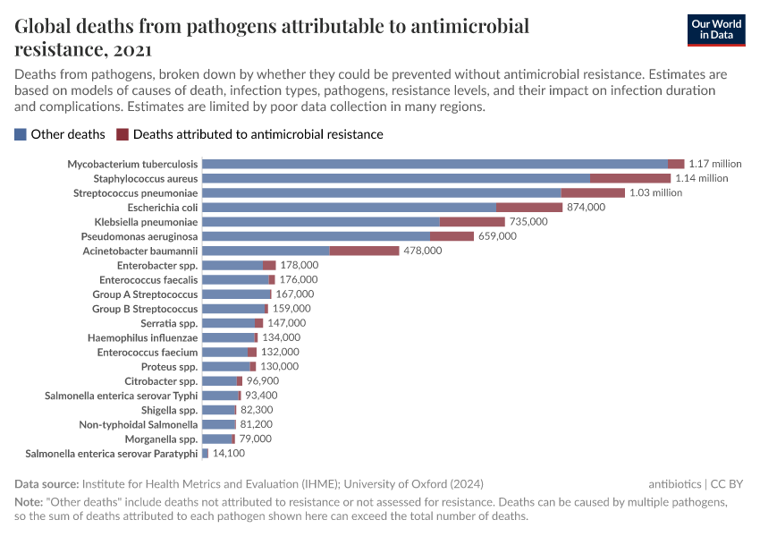 As you can see, deaths caused by antibiotic resistance are most common for bloodstream infections and lower-respiratory infections.