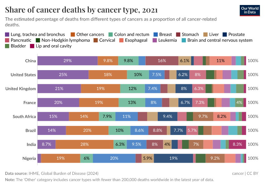 The share of cancer deaths from each type varies between countries. You can explore an interactive chart for different countries showing the relative share of all cancer deaths from each cancer type here:
