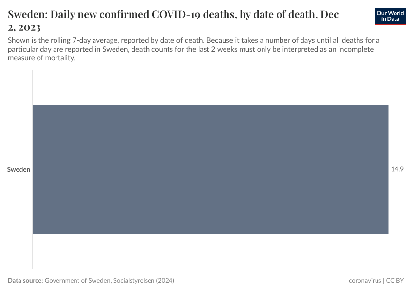 There are two ways that COVID-19 deaths can be presented over time: by the date of death, or the date on which the death is reported. The data for Sweden is shown by date of death – this means the most recent points should be treated as incomplete.