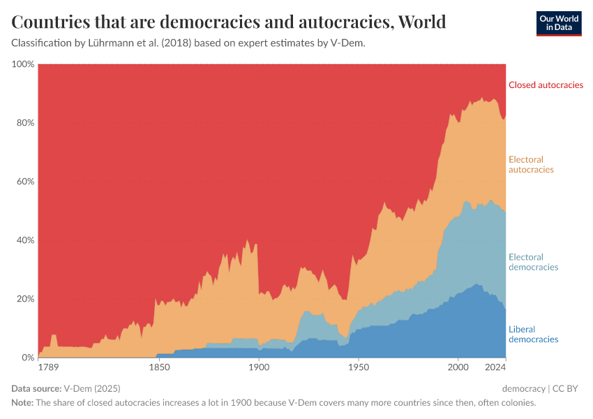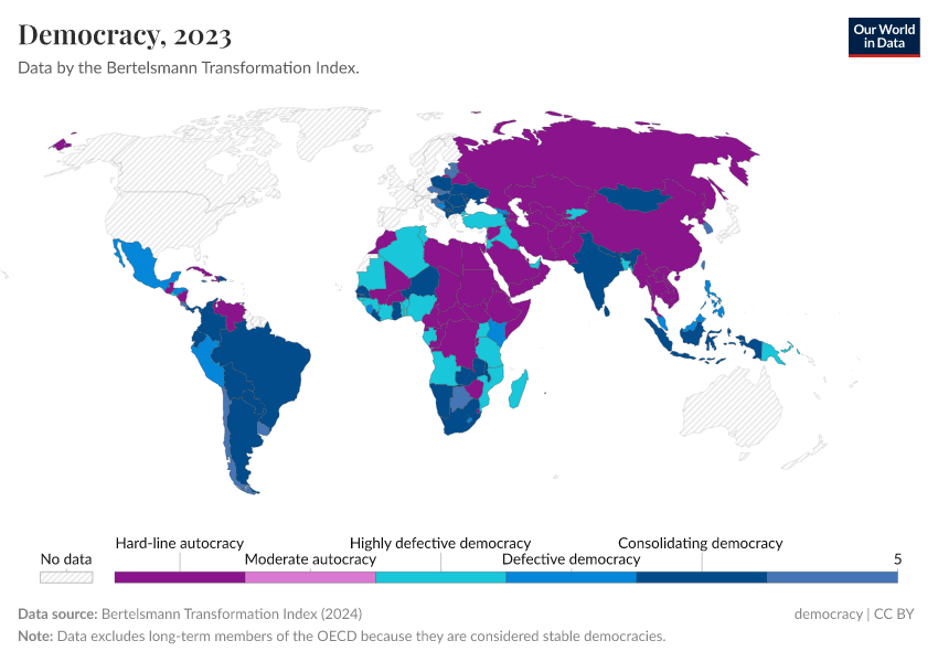 On this page, you can find data, visualizations, and writing on how democracy has spread across countries, how it differs between them, and whether we are moving towards a more democratic world.