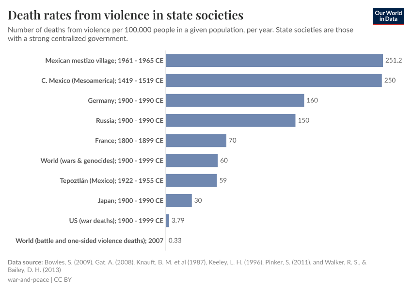 We see that the levels of violence in prehistoric times and in non-state societies differ widely between societies. But on average they tend to be significantly higher than in modern state societies and the world today.