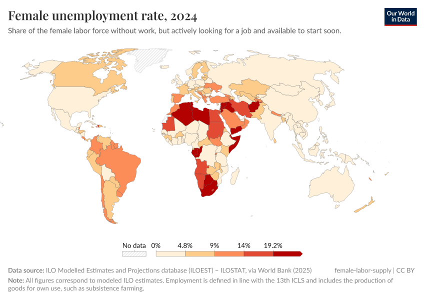 The map shows unemployment rates for women across the world. As we can see, the highest female unemployment rates correspond to the countries with the lowest female labor force participation, notably in North Africa and the Middle East.