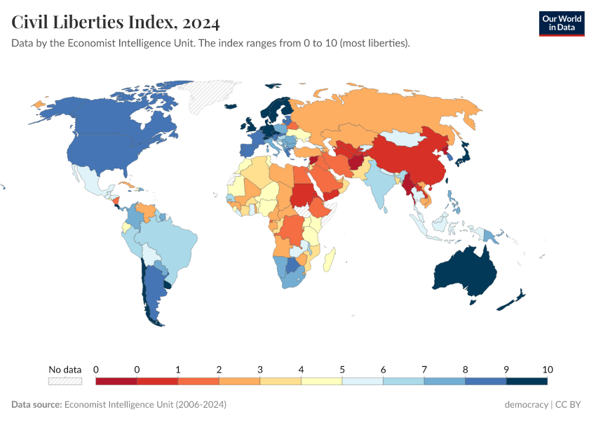 “Data Page: Civil liberties index”, part of the following publication: Bastian Herre, Lucas Rodés-Guirao, and Esteban Ortiz-Ospina (2013) - “Democracy”. Data adapted from Economist Intelligence Unit, Gapminder. Retrieved from https://ai-index.owid.pages.dev/grapher/civil-liberties-index-eiu [online resource]How to cite this data