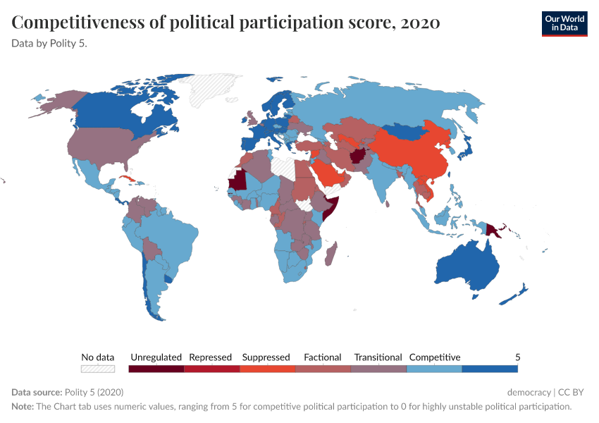 “Data Page: Competitiveness of political participation score”, part of the following publication: Bastian Herre, Lucas Rodés-Guirao, and Esteban Ortiz-Ospina (2013) - “Democracy”. Data adapted from Polity 5. Retrieved from https://ai-index.owid.pages.dev/grapher/competitiveness-of-political-participation-score [online resource]How to cite this data