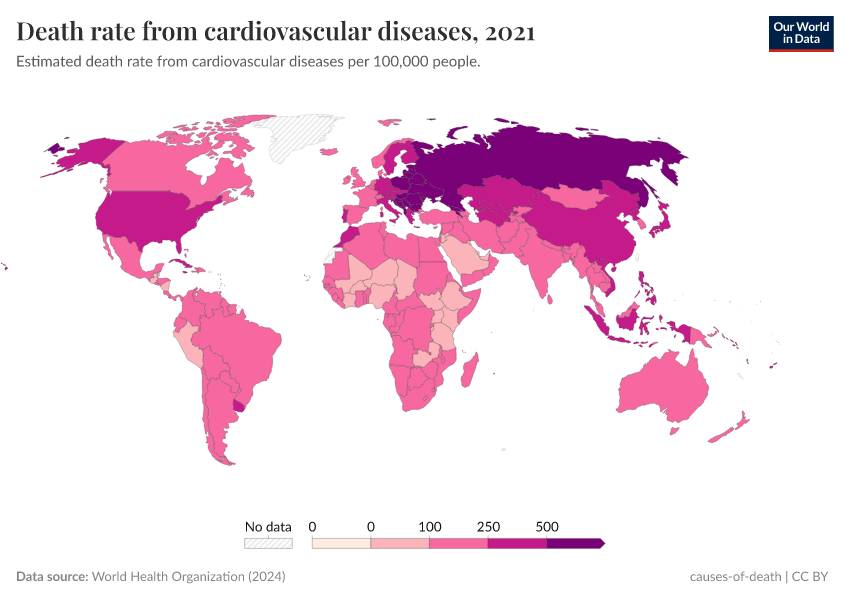 World Health Organization (2024) – with major processing by Our World in Data. “Death rate from cardiovascular diseases” [dataset]. World Health Organization, “Global Health Estimates” [original data]. Retrieved April 14, 2025 from https://ai-index.owid.pages.dev/grapher/death-rate-from-cardiovascular-disease-ghe