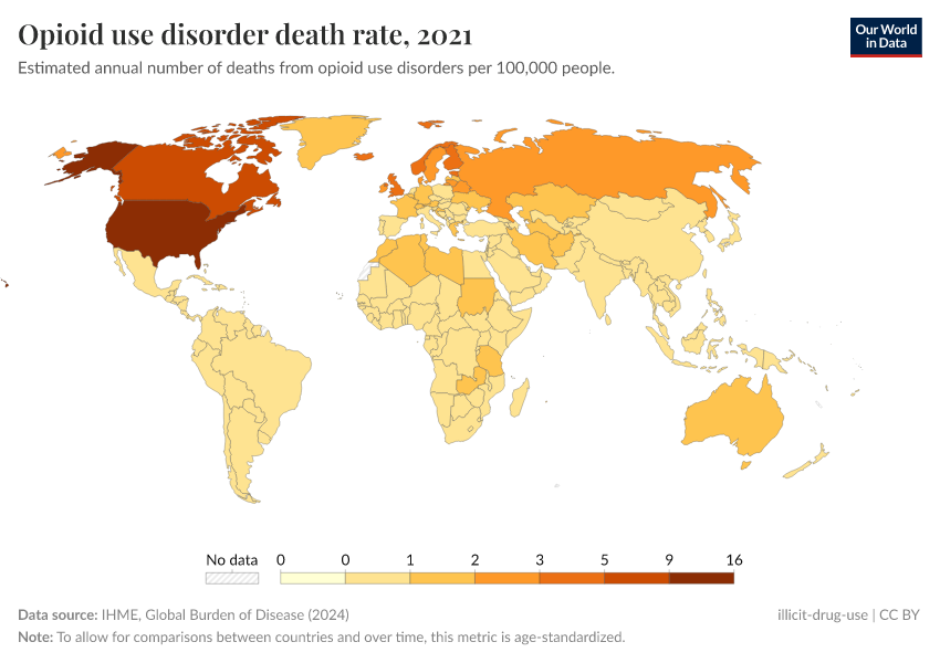 “Data Page: Opioid use disorder death rate”, part of the following publication: Esteban Ortiz-Ospina and Max Roser (2016) - “Global Health”. Data adapted from IHME, Global Burden of Disease. Retrieved from https://ai-index.owid.pages.dev/grapher/death-rate-from-opioid-use [online resource]How to cite this data
