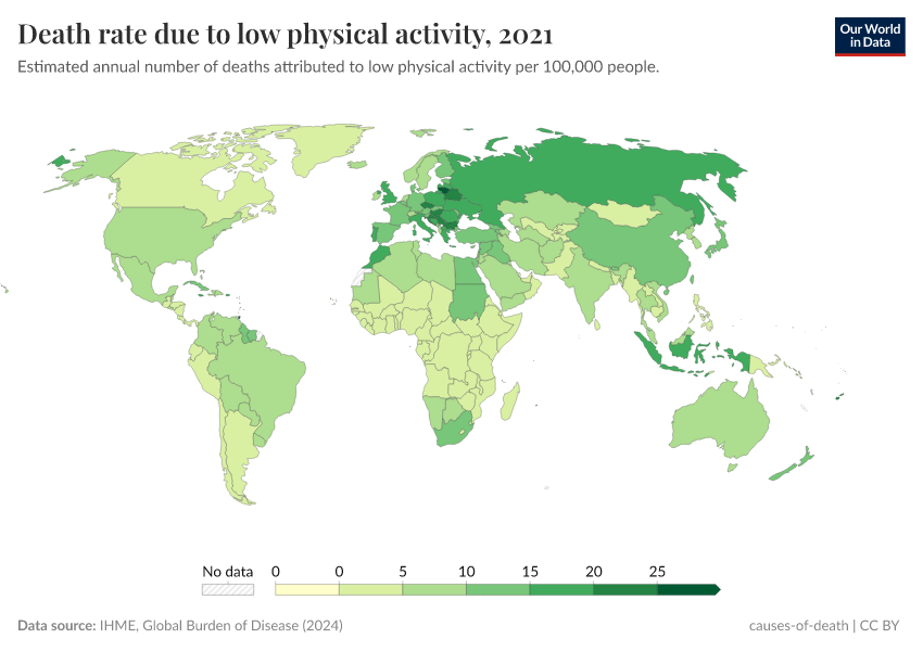 IHME, Global Burden of Disease (2024) – with minor processing by Our World in Data. “Death rate due to low physical activity” [dataset]. IHME, Global Burden of Disease, “Global Burden of Disease - Risk Factors” [original data]. Retrieved April 14, 2025 from https://ai-index.owid.pages.dev/grapher/death-rates-due-to-low-physical-activity-gbd