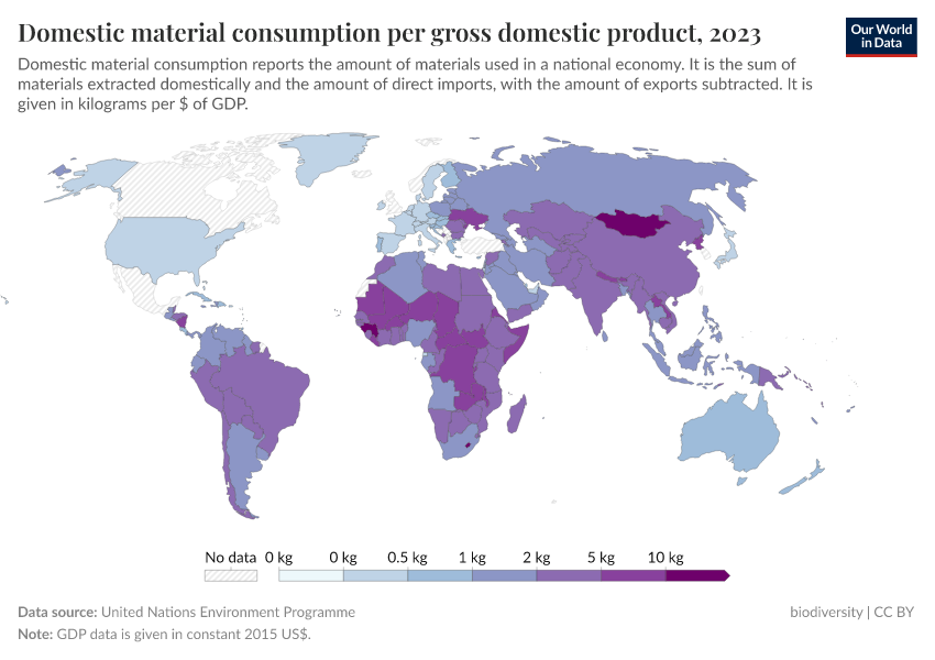 United Nations Environment Programme – processed by Our World in Data. “Domestic material consumption per gross domestic product” [dataset]. United Nations Environment Programme, “UN Statistics Division, Country Files from the UNSD/UNEP data collection on environment statistics (available at: https://unstats.un.org/unsd/envstats/country_files) - UNSD/UNEP Questionnaire, WESR / Global Material Flows Database, Eurostat” [original data]. Retrieved April 14, 2025 from https://ai-index.owid.pages.dev/grapher/domestic-material-consumption-per-unit-of-gdp