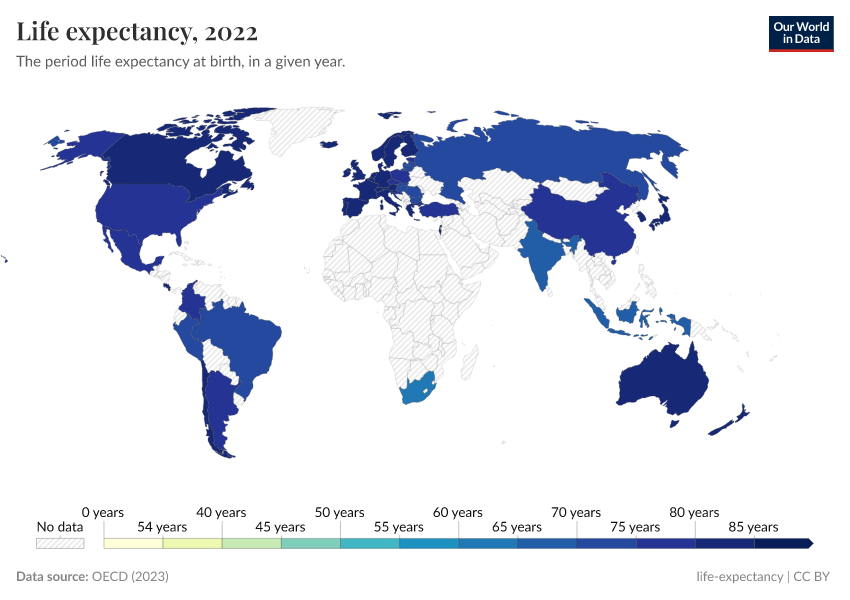 “Data Page: Life expectancy at birth”, part of the following publication: Saloni Dattani, Lucas Rodés-Guirao, Hannah Ritchie, Esteban Ortiz-Ospina, and Max Roser (2023) - “Life Expectancy”. Data adapted from OECD. Retrieved from https://ai-index.owid.pages.dev/grapher/life-expectancy-at-birth-oecd [online resource]How to cite this data
