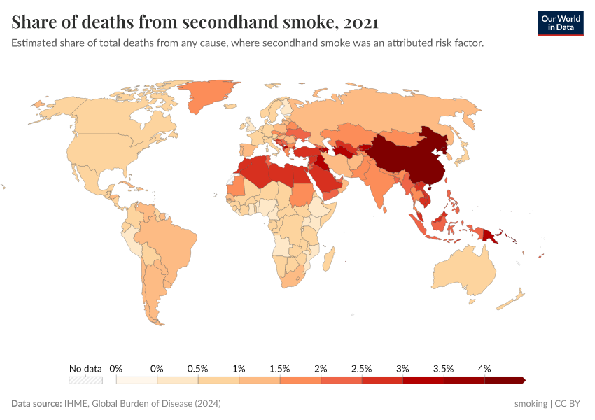 IHME, Global Burden of Disease (2024) – with minor processing by Our World in Data. “Share of deaths from secondhand smoke” [dataset]. IHME, Global Burden of Disease, “Global Burden of Disease - Risk Factors” [original data]. Retrieved April 14, 2025 from https://ai-index.owid.pages.dev/grapher/share-deaths-secondhand-smoke