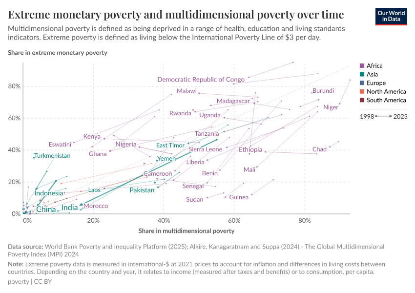 - Extreme poverty here is defined as living below the International Poverty Line of $2.15 per day.