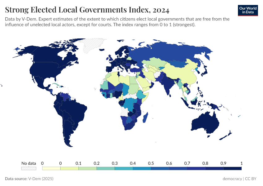 “Data Page: Elected local governments”, part of the following publication: Bastian Herre, Lucas Rodés-Guirao, and Esteban Ortiz-Ospina (2013) - “Democracy”. Data adapted from V-Dem. Retrieved from https://ai-index.owid.pages.dev/grapher/strong-elected-local-governments-index [online resource]How to cite this data