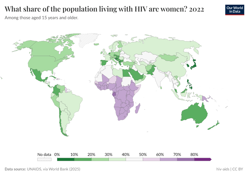 There are differences in the prevalence of HIV and death rates from AIDS between men and women. The chart shows the share of women in populations living with HIV.