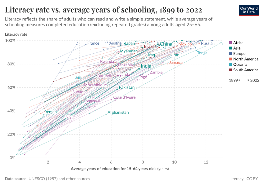 The correlation between educational attainment and literacy holds across countries and over time. The next chart shows this by plotting changes in literacy rates and average years of schooling.
