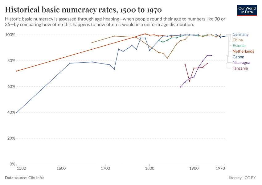 Numeracy is the ability to understand and work with numbers. The visualization shows how this ability became more common in populations around the world based on a very basic definition of numeracy, the ability to state one's own age correctly.