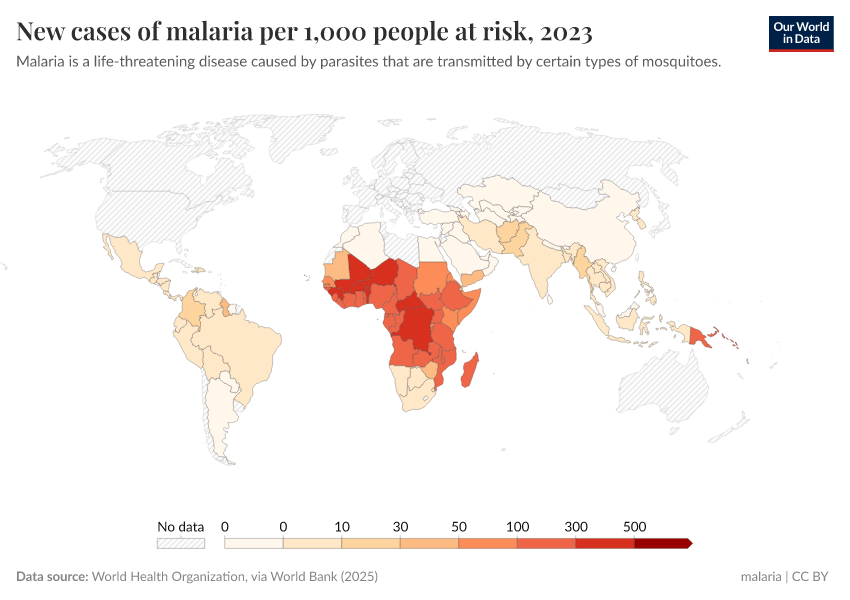 Malaria was once prevalent in many of today's richest countries, but it was eliminated there over the last century. Today, malaria still affects some of the poorest countries in the world, as the chart shows.