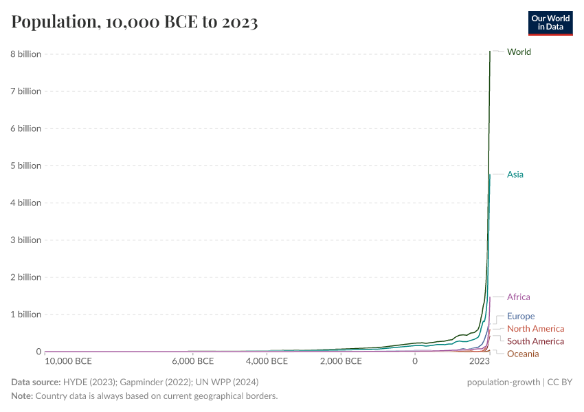 On this page, you will find all of our data, charts, and writing on changes in population growth. This includes how populations are distributed worldwide, how this has changed, and what demographers expect for the future.