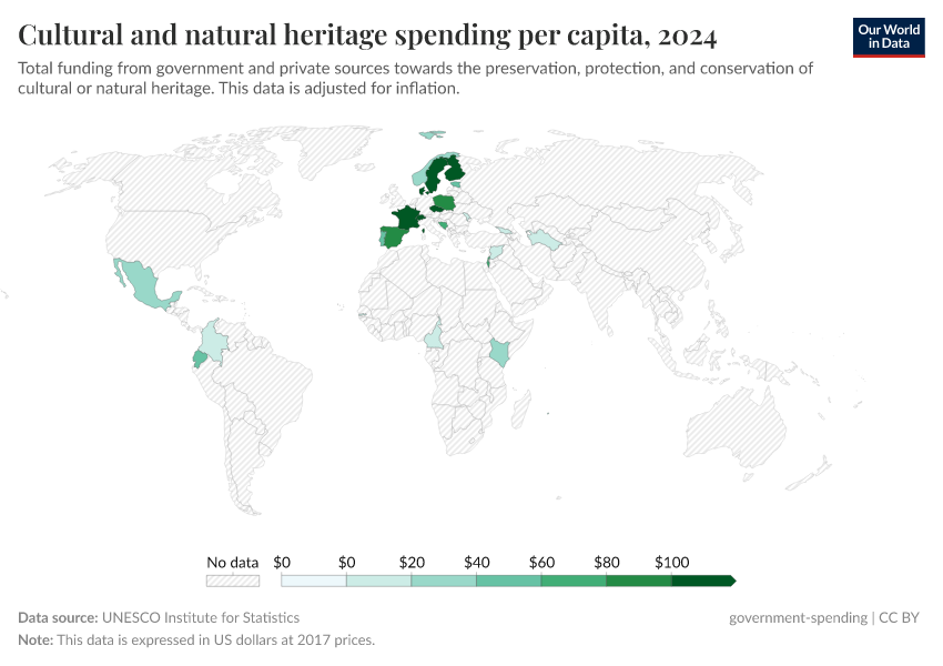 Data for this indicator is shown in the interactive visualization. It is given as per capita expenditure – from public and private sources – on cultural and natural heritage preservation, protection, and conservation. This data is reported in constant dollars, which adjusts for inflation.