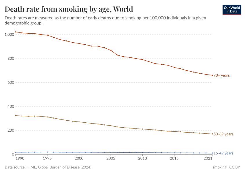 Here, we see that death rates from smoking are much higher in people older than 70 years old, followed by those aged 50 to 69.