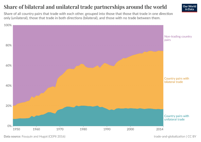 If we consider all pairs of countries that engage in trade around the world, we find that in the majority of cases, there is a bilateral relationship today: most countries that export goods to a country also import goods from the same country.