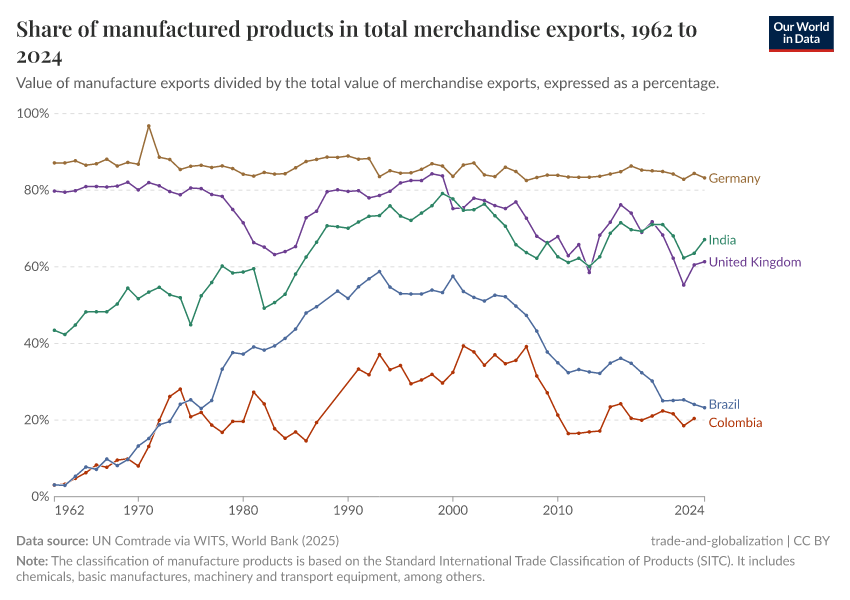 An important change in the composition of exported goods in these countries has accompanied the increase in trade among emerging economies over the last half century.