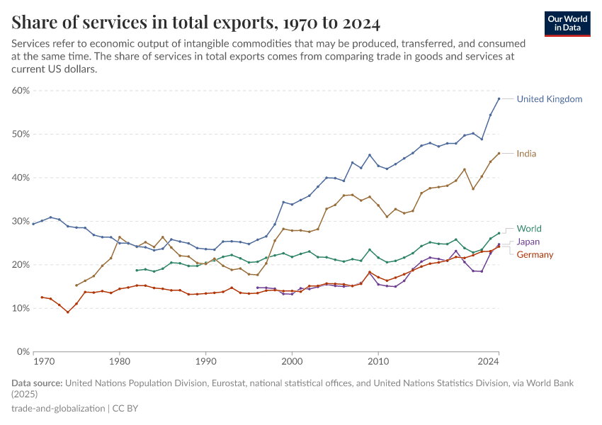 Globally, trade in goods accounts for the majority of trade transactions. But as this chart shows, the share of services in total global exports has slightly increased in recent decades.8