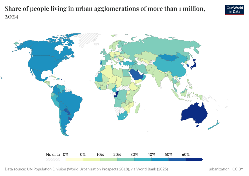 Although the definition of 'urban' gives us some indication of population densities, it does not differentiate between those who live in small versus large urban settings. In the chart, we show the percentage of the total population that lives in agglomerations greater than one million people (i.e. large urban agglomerations). These figures are available in absolute terms (the total number of people living in large urban settings), found here.